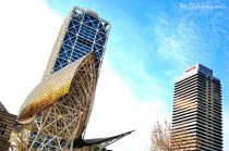 A view of the two skyscrapers Hotel Arts and Mapfre Tower at the Olympic Port of Barcelona. You can also see the Golden Fish sculpture by Frank Gehry.